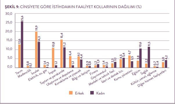 Kadınların emek piyasasından geri çekilmelerinin bir diğer önemli nedeni ise Covid-19 salgınında öncelikli olarak kapatılan sektörlerin kadınların yoğun istihdam edildiği alanlar olmasıdır. Dünya Çalışma Örgütünün (ILO) salgının hangi sektörleri daha çok etkilediğini inceleyen çalışması eğitim, sağlık, eğlence sektörlerinin salgından en çok etkilenenler olduğunu göstermektedir. Sağlık sektöründeki kadın istihdam oranı %70,4, eğitim sektöründe oran %61, ve eğlence sektörü kadın istihdam oranı %57,2’dir. Uzmanlar kadınların ev içindeki görev dağılımına benzer olarak daha çok bakım ve insanla iletişim odaklı alanların kadınların çalışma alanları olarak yer almasının bu salgınla istihdamı azaltıcı neden olarak gösteriyor. Kadınlara daha fazla bakım odaklı işlerin kalmasının da erkek egemen bir ekonomik yapının yansıması olduğu biliniyor. Bu durum 2008 ekonomik krizi ile salgının yarattığı krizi kıyasladığımızda daha çok anlaşılıyor. 2008 krizinde inşaat, finans gibi daha çok erkeklerin yoğunlukta çalıştığı alanlarda işsizlik artmıştı. Ancak ekonomik krizden farklı olarak salgın kadınların yoğunlukta çalıştığı bakım alanlarına yoğunlaşıyor. Bu bize iki şey gösteriyor. Birincisi ekonomik krizlerde erkek istihdamı daha da azaltan faktörün kadınların emek piyasasında daha az yer alması olduğu iken ikincisi salgında kadınların sektör dağılımda cinsiyetçi yansımasını salgında gördüğümüz oluyor.